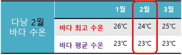베트남 다낭 2월 바다 평균 수온은 23도입니다.